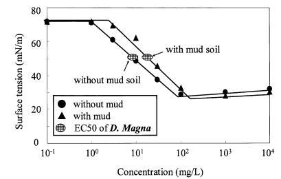 圖11泥質土壤存在對LAS表面張力曲線和大型水蚤有毒表面張力值的影響。