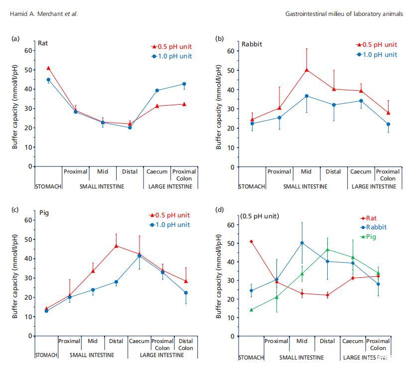 圖1(a)來自大鼠(n=3),(b)兔子(n=6),(c)豬(n=3)的混合樣品的胃腸液(上清液)緩沖容量(平均值±標(biāo)準(zhǔn)偏差(SD)),在pH單位變化0.5和1.0時(shí)測量,以及(d)整個(gè)胃腸道緩沖容量的種間趨勢。