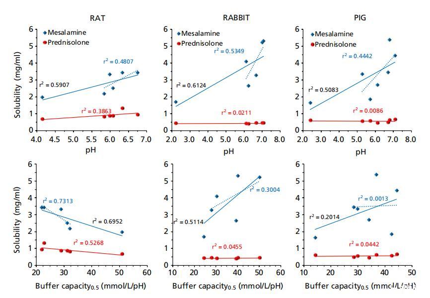 潑尼松龍的水溶性為0.223mg/ml;[11] 該值低于這些調(diào)查中觀察到的值(表1)。潑尼松龍的溶解度是合理恒定的,與豬和兔腸道樣本的位置無關(guān),并且更接近于之前測量的人類空腸、回腸和結(jié)腸液體中的溶解度[11](圖4)。然而,從胃到小腸中部,潑尼松龍?jiān)诖笫篌w內(nèi)的溶解度呈上升趨勢,此后,在遠(yuǎn)端小腸中的溶解度下降,但在腸道下方?jīng)]有明顯變化。強(qiáng)的松在大鼠腸道液體中的溶解度通常高于人類,但在近端結(jié)腸除外,因?yàn)榻私Y(jié)腸的變異性更高,所以差異沒有達(dá)到統(tǒng)計(jì)學(xué)意義。與大鼠胃液相比,大鼠近端腸道的特殊溶解行為可能是由于近端和中段小腸的表面張力相對較低(表1)。由于潑尼松龍是一種可結(jié)合的化合物,其溶解度預(yù)計(jì)與pH無關(guān);這與我們的研究結(jié)果是一致的。在任何受試動(dòng)物物種中,潑尼松龍溶解度與緩沖容量、滲透壓或表面張力之間也沒有顯著關(guān)系(圖5)。