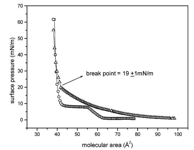 圖1.朗繆爾單分子膜的表面壓力-面積曲線:純DMPA(O)和DSAP/DMPA(1:3500,mol:mol)(4)。 曲線中顯示的斷點與混合單層的LE-LC轉(zhuǎn)變有關。
