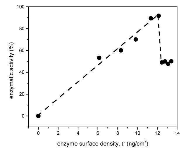 在5到18 mN/m的表面壓力下,DMPA的表面密度從1.45×1017分子/m2變化到2.30×1017分子/m2。 考慮到DMPA和DSAP都保留在界面上,單層的壓縮應減少磷脂和蛋白質(zhì)的可用面積。 因此,可以估計酶的表面密度,并將其與酶活性關聯(lián)起來(圖2)。 高達12.1 ng/cm2(對應于18 mN/m的表面壓力)時,觀察到線性相關性,表明活性的增加直接反映了酶表面密度的增加。 然而,當?shù)鞍踪|(zhì)表面密度高于12.1 ng/cm2時,酶活性會突然下降。