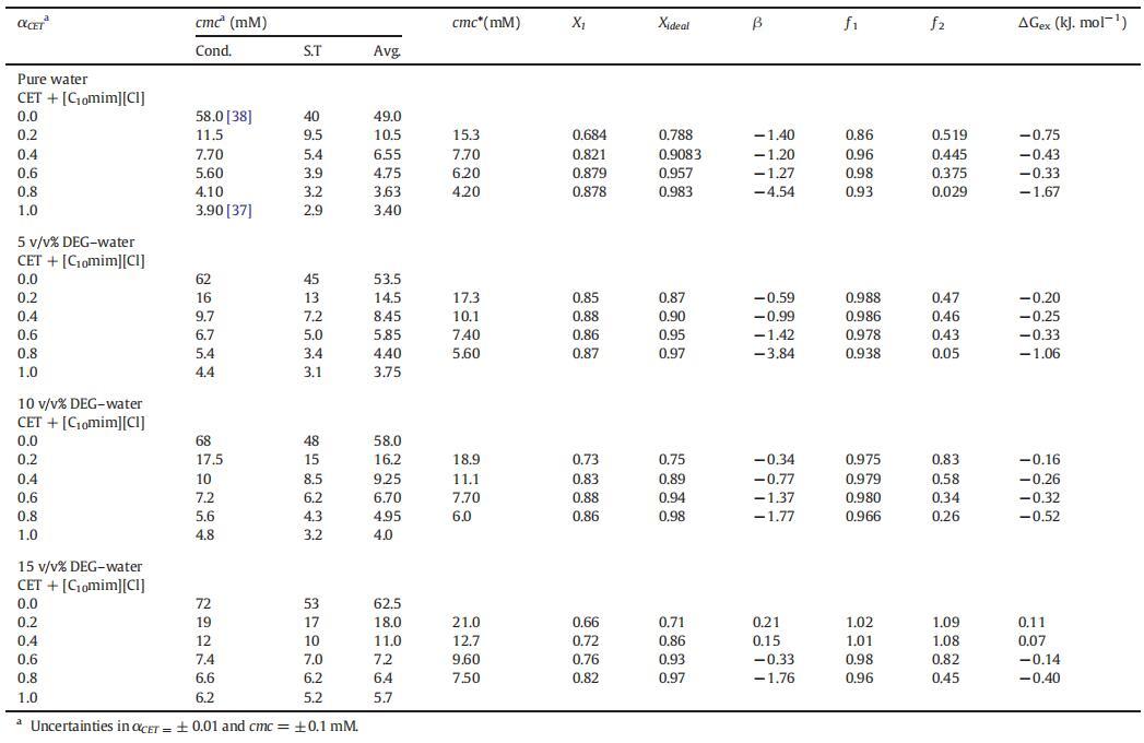 表1(cmc)、平均值(cmc)、理想值(cmc*)、膠束組成(X1,Xideal)、相互作用參數(β)的值,混合物CET+[C10min][Cl]的活度系數(?1,?2)和混合過量自由能(ΔGex),作為純水中CET摩爾分數(α)的函數,以及在T=298.15 K時DEG-水二元混合物的不同體積百分比。