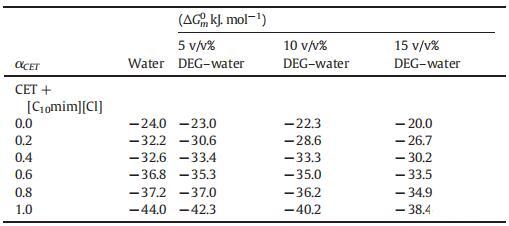 從表2中可以清楚地看出,g值并不遵循特定的趨勢,但是隨著DEG在混合系統中的體積百分比的增加,其g值以某種方式增加,這種增加可能是因為膠束的表面電荷密度降低,這是由于膠束聚集數減少所致。水和DEG-水二元混合物中CET、[C10min][Cl]和CET+[C10min][Cl]混合膠束的標準吉布斯自由能(ΔGm0)值如表3所示。如表3所示,隨著二甘醇與水的體積百分比的增加,膠束化過程變得不那么自發。