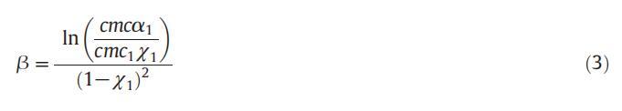 由β表示的相互作用參數給出了混合膠束中兩個單體之間的吸引相互作用的信息,可使用式(3)計算: