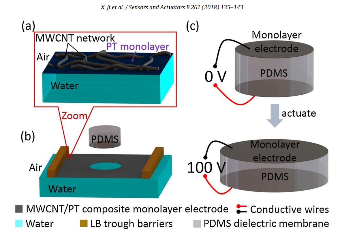 圖1。使用Langmuir-Schaefer轉(zhuǎn)移單層電極制作低壓DEA(a)在空氣-水界面形成的單層復(fù)合電極:嵌入聚(烷基噻吩)(PT)單層內(nèi)的互連MWCNT網(wǎng)絡(luò)。(b)Langmuir-Schaefer(LS)將復(fù)合單分子膜從空氣-水界面轉(zhuǎn)移到PDMS介電膜上,制成DEA的一個(gè)電極。(c)DEA由一層1.4μm厚的硅酮膜組成,硅酮膜夾在兩個(gè)亞100 nm厚的復(fù)合單層電極之間。