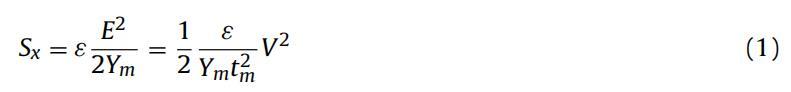 DEA的最大應(yīng)變受到DE擊穿場(chǎng)的限制(更準(zhǔn)確地說,DEA的失效模式是機(jī)電不穩(wěn)定性[13],但擊穿場(chǎng)是小應(yīng)變致動(dòng)器配置的關(guān)鍵限制因素)。對(duì)于厚度為10μm至100μm的典型彈性體,以及在100–150V/μm的典型彈性體擊穿場(chǎng)附近工作,DEA需要1kV至15kV以達(dá)到最大應(yīng)變。由于高壓電子設(shè)備的成本、尺寸和效率,這些高工作電壓限制了DEA的一些可能應(yīng)用。因此,為了降低DEA的工作電壓,同時(shí)保持相同的驅(qū)動(dòng)性能,進(jìn)行了大量的研究。從式(1)中可以看出,為了在降低電壓的同時(shí)保持給定的驅(qū)動(dòng)應(yīng)變,ε必須增加[9,14],或者Ym和tm必須減少[15,16]。應(yīng)變電壓平方比(Sx/V2)指標(biāo)已用于比較不同工作電壓下DEA的性能[16]。對(duì)于厚度為3μm的DEA,降低膜厚度tm導(dǎo)致先前報(bào)告的最高Sx/V2值為125%/kV2,在245V下產(chǎn)生7.5%的線性應(yīng)變[16]。考慮到電極通常比彈性體更硬(對(duì)于DEAs中使用的幾乎所有材料,Ye>Ym),當(dāng)膜變薄時(shí),電極厚度te或電極剛度Ye也必須進(jìn)一步減小,以保持驅(qū)動(dòng)應(yīng)變,如式(2)所示。