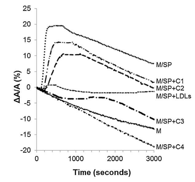 圖5。注入(…)后,由單層(M)覆蓋并在不含(-)額外分子的緩沖液上形成的界面的相對表面積隨時間的變化SP(26.6±1.5 mg蛋白質)、SP(26.6±1.5 mg蛋白質)和不同濃度(··-)C1、(·-)C2的脂質體的混合物,(·-)C3和(·-)C4(分別為1.17±0.02 mg、2.18±0.02 mg、4.37±0.02 mg和6.55±0.02 mg脂質)和(---)LDL(4.6 mg PC)和SP(26.6±1.5 mg蛋白質)的混合物??諝?緩沖界面處的溫度為34℃。表面壓力保持在25 mN/m。