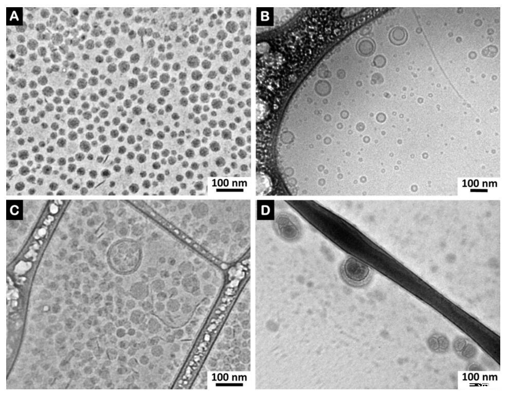 圖7。(A)低密度脂蛋白,(B)脂質體,(C)低密度脂蛋白和精漿(精漿中的比例為0.17 mg PC/mg BSP蛋白質)和(D)脂質體和精漿(精漿中的比例為0.16 mg PC脂質體/mg BSP蛋白質)的冷凍電鏡圖像。