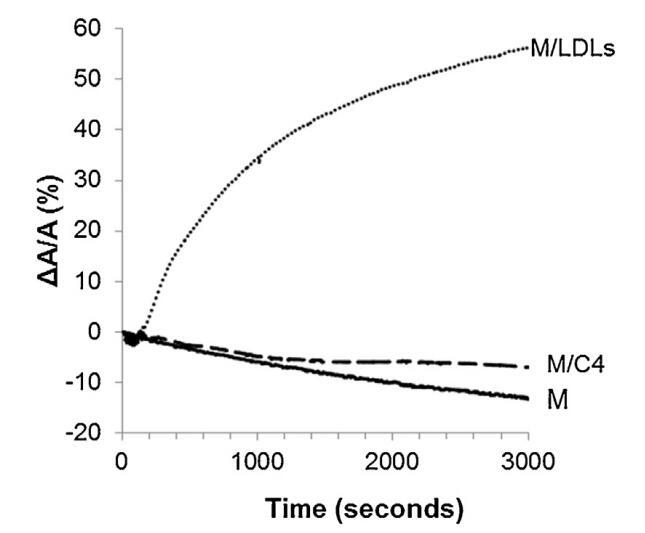 圖4。單層(M)所覆蓋的界面的相對表面積隨時間的變化,該單層(M)以25 mN/M的速度壓縮,并在不含任何額外分子(-)的緩沖液上形成,(…)LDL(4.6 mg PC)和(-)脂質體C4(含4.8 mg PC)??諝?緩沖界面處的溫度為34℃。