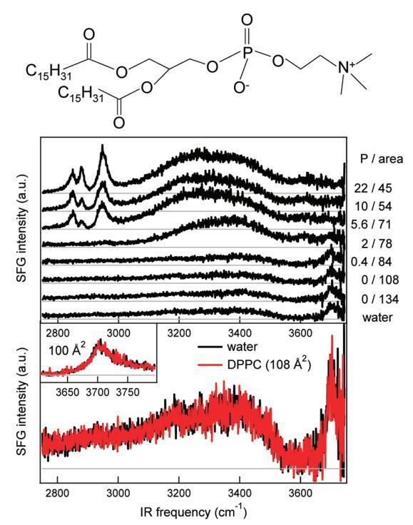 圖1。頂板:DPPC的分子結(jié)構(gòu)。中間面板:裸露水面(底部光譜)和密度增加的水中DPPC的SSP極化SFG光譜。壓力(mN/m)和每個(gè)分子的面積(?2)分別從底部到頂部增加和減少,在圖表旁邊給出。每個(gè)分子的面積由氯仿溶液滴的數(shù)量控制。CH(2800)?3000厘米?1),氫鍵OH(3000?3600厘米?1),還有免費(fèi)的哦(~3705厘米?1)拉伸振動(dòng)可見。底部面板:從裸露水面的中間面板放大,每個(gè)分子的DPPC為108?2,以表明它們的相似性。插圖放大了裸露水面和DPPC(100?2)表面的自由OH拉伸振動(dòng)區(qū)域。在每個(gè)分子的這個(gè)區(qū)域,壓力仍然低于檢測極限,表面上DPPC的存在顯然不影響自由OH拉伸振動(dòng)的振幅。相對較高的紅外通量(~10 mJ/cm2)用于本實(shí)驗(yàn)。