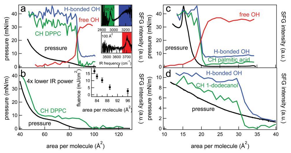 圖2。(a)DPPC的CH信號(綠色)、氫鍵OH信號(藍(lán)色)和自由OH信號(紅色)的表面壓力(黑色,左軸)和積分SFG強(qiáng)度(右軸),作為連續(xù)壓縮單層過程中每個(gè)分子面積的函數(shù)。為了清晰起見,集成SFG信號被歸一化,并且彼此之間具有小偏移。集成光譜區(qū)域由插圖中的彩色正方形標(biāo)記,分別顯示CH/OH鍵合和游離OH區(qū)域中每個(gè)分子50和100?2的SFG光譜。相對較高的紅外通量(~已使用10 mJ/cm2)。(b)與(a)類似,但紅外功率降低了四倍,導(dǎo)致通量降低了四倍(~2.5 mJ/cm2)。插圖顯示了改變紅外注量對SFG信號出現(xiàn)的每個(gè)分子面積的影響。(c)類似于(a),但適用于棕櫚酸。(d)類似于(a),但對于1-十二醇。在這種情況下,未測量1-十二醇的游離OH。SFG結(jié)果是在SSP極化下獲得的。