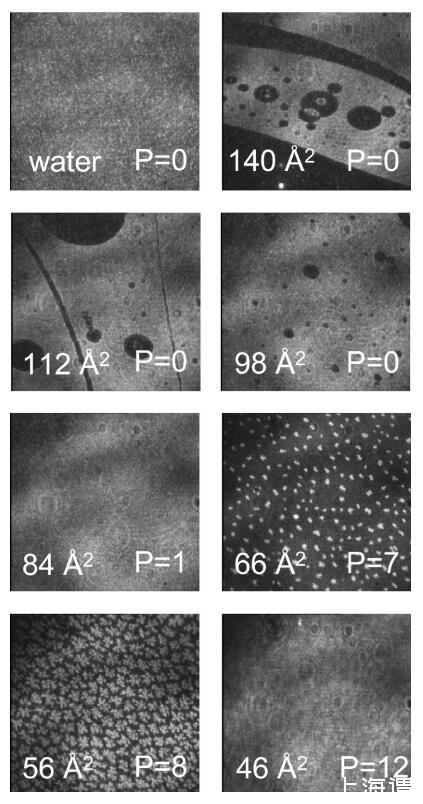 圖3。水上不同密度DPPC的布儒斯特角顯微鏡圖像。圖像大小為600×600μm。白色區(qū)域表示高密度,而黑色區(qū)域表示低密度。在每個(gè)面板中,每個(gè)分子的面積(單位為?2)在左下角報(bào)告,表面壓力(單位為mN/m)在右下角報(bào)告。這些照片是用自動(dòng)調(diào)整靈敏度的相機(jī)拍攝的,這樣就無法比較圖像之間的灰度等級。