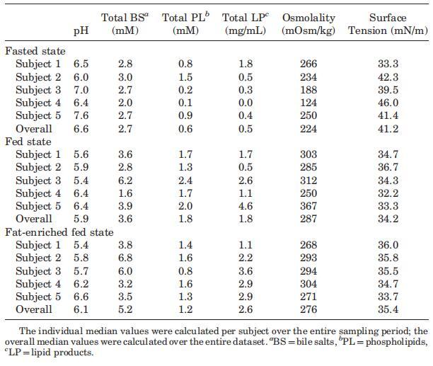 當考慮五個不同的受試者時,總膽汁鹽濃度隨時間的變化在所有三種營養狀態下都呈現波動模式(圖3)。無法定義可應用于每個單獨圖表的清晰的濃度-時間曲線。文獻中也報道了喂食條件下膽汁鹽濃度的高度變化??梢哉业礁哌_37 mM27和低至0.5 mM33的值;然而,文獻中觀察到的典型膽鹽濃度約為10mm,在進食后30–60分鐘檢測到。11,12,19,33在本研究中,攝入Sure Plus1后30分鐘,膽汁鹽濃度中值為8.3 mM;在高脂肪喂養狀態下,30分鐘后獲得的中值為11.9 mM。這些中值與文獻中觀察到的典型值一致。相比之下,五名登記受試者的單獨匯集腸道樣本顯示,在兩種喂養狀態下,總膽汁鹽濃度均低于5.3 mM。同樣在禁食狀態下,當不存在膽囊收縮刺激時,可以看到高度可變和時間依賴性的膽鹽濃度:濃度范圍為0.3至9.6 mM(圖3)。Lindahl等人的一項研究也描述了類似的高變異性。34作者報告了24名志愿者的禁食狀態膽鹽濃度,范圍在0.1至13.3 mM之間,總收集時間為150分鐘。Brouwers等人2和Perez de la Cruz Moreno等人24也報告了禁食狀態下的膽鹽濃度單個志愿者的小腸,分別為1.0至5.3 mM和0.5至5.5 mM。使用當前數據集計算的個體膽汁鹽濃度中位數顯示出較小的受試者間變異性,最小值為2.0 mM,最大值為3.0 mM;總體中值為2.6 mM(表2)。這些中值與禁食狀態下報告的膽鹽水平相當吻合:之前的文章描述了禁食狀態下總膽鹽濃度在2.0和5.9mm之間。11–13,19與當前設置中采用的120分鐘的總取樣周期相反,在后述報告中使用單時間點測定來評估空腹水平。11–13,19