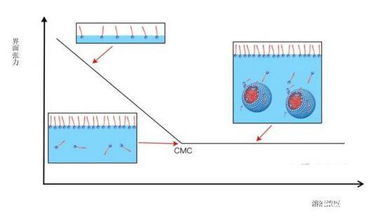 但是當濃度超過一個點時,表面活性劑會開始抱團,形成膠束,界面張力不再下降,這個濃度叫做臨界膠束濃度。