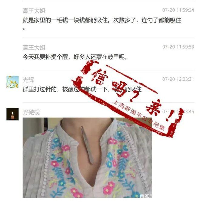 近日,多條“做完核酸檢測身體變磁鐵”的消息在微信群中流傳,有人稱廣東一女子做完核酸檢測一個星期之內(nèi),身體吸住了金屬!根據(jù)這些消息,有人稱“以后不要再做核酸檢測了,越做身上‘磁’越多”,甚至有人號召大家拒絕做核酸檢測。
