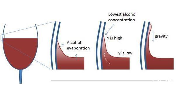 瑪拉高尼效應(yīng)不光存在于物理實(shí)驗(yàn)和我們之前開的玩笑之中,在我們的日常生活中也有馬拉高尼效應(yīng)的體現(xiàn),這一現(xiàn)象可能每一個(gè)人都見過,那么就是我們在喝酒的過程中看到的所謂的好酒會(huì)掛壁的現(xiàn)象。就算再好的酒,它也是有水在其中的。好酒中的酒精由于毛細(xì)效應(yīng)爬到高處的時(shí)候,酒精蒸發(fā),使得處于上層的酒液的酒精含量相比較于下層來說要低,而同時(shí)的酒的表面張力要比水小,兩種液體表面張力的差距就形成了馬拉高尼效應(yīng)。