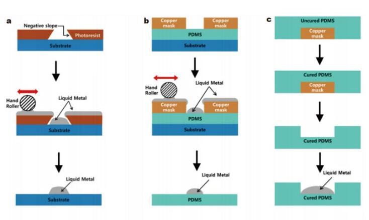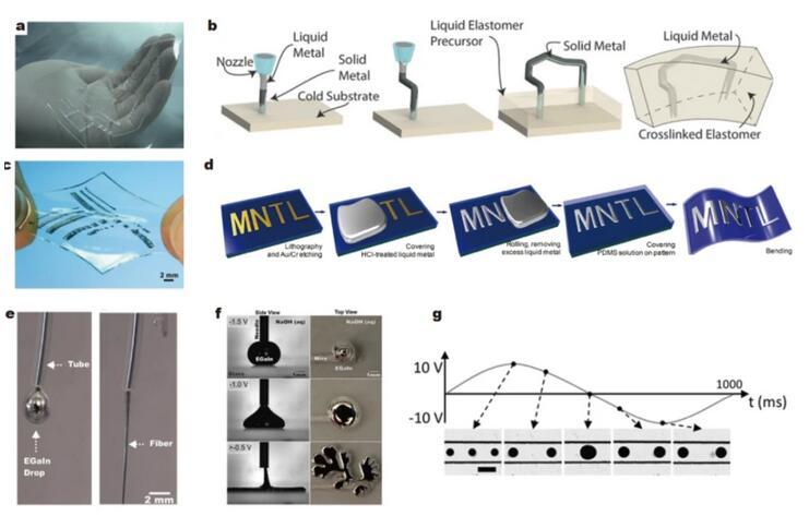 除了某些特定材料的表面(金、銅、錫等)可以潤濕外,使用施加電壓等方法也可以改變液態(tài)金屬的潤濕特性,使其在基材表面擴散,在此基礎(chǔ)上可以制造出可拉伸的電子設(shè)備。