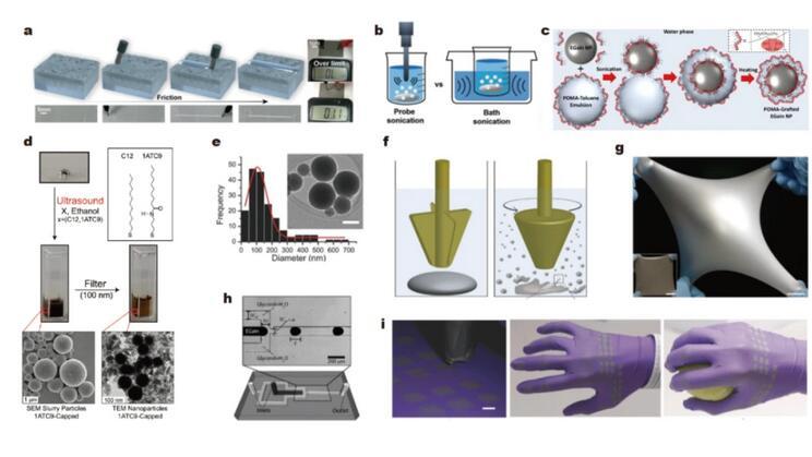 使用超聲和剪切等自上而下的方法將液態(tài)金屬從一個大的液滴分割成許多微米級或納米級的液滴,并保證其粒度分布相對均勻。氧化層或其他人工形成的表面修飾將暫時阻止液滴的重新結(jié)合。可拉伸電子設(shè)備的圖案可以通過排列這些液滴來繪制,這相當于通過減小粒徑以增加比表面積(增加氧化層比例)進而降低表面張力。
