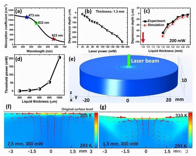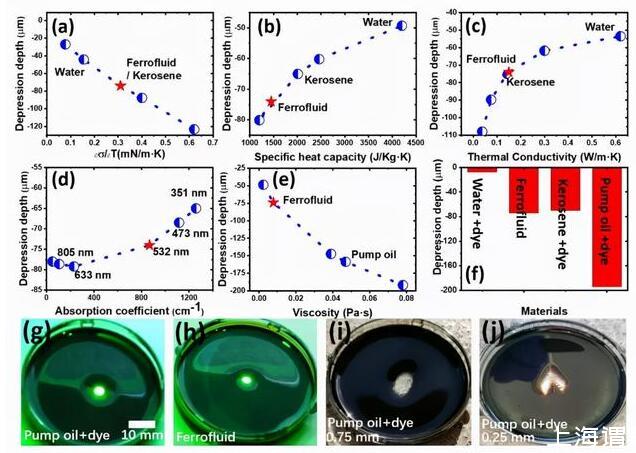 他們發現,液體的厚度、表面張力的溫度系數、熱導、比熱容、吸光性和粘度等物理參數,都會對光致液體形變產生重要影響,尤其是吸光系數和液體的表面張力溫度系數。