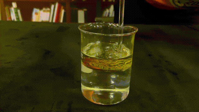 首先,我們沿杯壁向盛有水的燒杯中加入食用油,使水油有一個干凈的界面