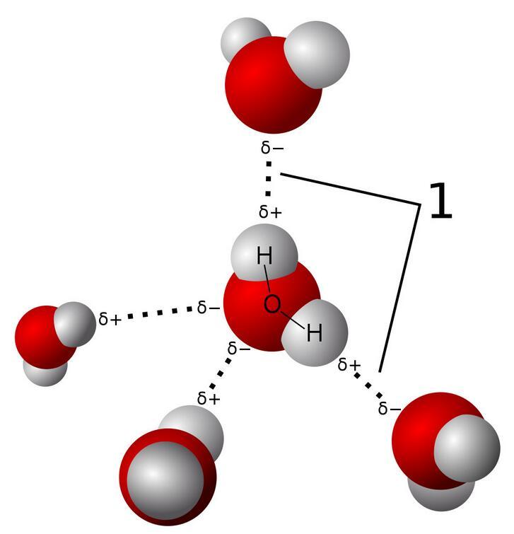 水分子通過(guò)氫鍵互相連接形成大的水分子團(tuán),氫鍵比范德華力更強(qiáng)大,所以水分子會(huì)首先與相鄰的極性分子相互吸引并結(jié)合,從而形成表面張力。水可以接納其它同樣極性分子基團(tuán)(例如OH、NH基團(tuán)),但對(duì)非極性基團(tuán)具有排斥性,它會(huì)拒絕其它分子特別是非極性分子加入,因此水顯示出對(duì)非極性物質(zhì)(例如油)的排斥力。