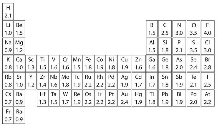上圖是元素周期表中部分元素電負(fù)性的標(biāo)量,電負(fù)性是一個(gè)無(wú)單位數(shù),數(shù)字越高,原子吸引電子的能力越強(qiáng)。我們可以通過(guò)確定參與共價(jià)鍵的兩個(gè)原子的電負(fù)性的差異來(lái)判斷共價(jià)鍵的極性:
