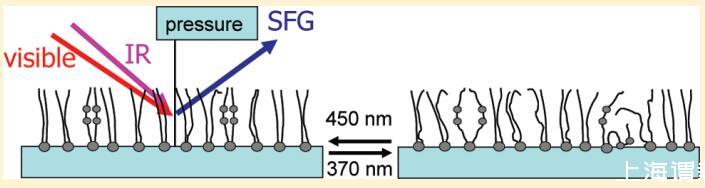 在此,我們研究了光開(kāi)關(guān)脂質(zhì)DT Azo-5P(圖1)的單分子膜,該單分子膜是純的,并與脂質(zhì)1,2-二棕櫚酰-sn-甘油-3-磷酸膽堿(DPPC)混合。如圖1中的紫外/可見(jiàn)光譜所示,光活性脂質(zhì)可分別在370 nm和450 nm的光照下從其反式狀態(tài)切換到順式狀態(tài)并返回。我們將表面壓力測(cè)量與無(wú)標(biāo)簽、寬帶振動(dòng)和頻產(chǎn)生(VSFG)光譜相結(jié)合。這些技術(shù)使我們能夠研究空氣-水界面上的脂質(zhì)分子單層。可以獲得有關(guān)脂類與水分子相互作用的信息以及脂類的分子結(jié)構(gòu)。在非線性光學(xué)技術(shù)VSFG中,紅外(IR)光束和可見(jiàn)光(VIS)光束在界面處組合,產(chǎn)生具有兩個(gè)入射光束和頻率的信號(hào)。如果紅外與分子振動(dòng)共振,信號(hào)就會(huì)強(qiáng)烈增強(qiáng)。研究表明,這種通過(guò)分子振動(dòng)的技術(shù)可以提供有關(guān)脂類分子構(gòu)象和取向的信息。11-18和頻產(chǎn)生在中心對(duì)稱介質(zhì)中是被禁止的,因?yàn)樗且粋€(gè)二階非線性光學(xué)過(guò)程。19因此,該技術(shù)對(duì)中心對(duì)稱材料(例如水表面)的最外表面分子層敏感。相反,缺少信號(hào)表明界面上的材料或分子基團(tuán)是中心對(duì)稱的。對(duì)于金表面偶氮苯功能化的自組裝單分子膜,SFG在確定光異構(gòu)化的截面和機(jī)理方面非常有用。得出的結(jié)論是,光異構(gòu)化是由直接電子激發(fā)驅(qū)動(dòng)的,類似于液相中的偶氮苯。3我們將表明,通過(guò)切換光脂,可以可逆地控制脂質(zhì)的表面壓力和分子順序。在同時(shí)含有光脂和脂質(zhì)DPPC的混合單分子膜中,我們可以通過(guò)光學(xué)切換偶氮苯基脂質(zhì)來(lái)控制DPPC的順序。這為體外控制脂質(zhì)-脂質(zhì)相互作用提供了一種新的手段。