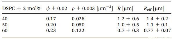 表1考慮的單分子膜的凝聚面積分數、數密度、平均半徑和有效半徑。誤差由標準差確定,但f除外,f是通過改變閾值確定的,如實驗部分所述