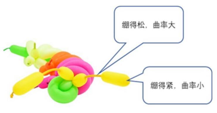 氣球內部的氣體壓力處處相等,因此,氣球內外的壓差是一個常數。但是,接觸過這種氣球的人都有一個經驗,就是粗的地方繃得緊,而細的地方繃得就不那么緊。也就是說,在起球不同的地方,皮膜的張力是不同的,如上圖所示。那么問題就來了,繃得緊的地方和繃得松的地方,產生的壓力差卻是相等的,這是為何?
