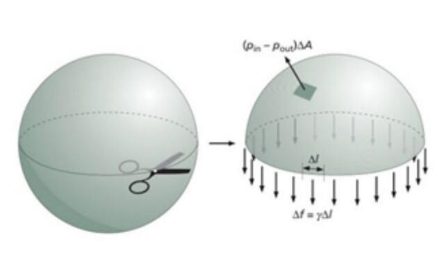 我們很容易就會看到,由于表面張力的存在,此時內部的壓力肯定要大于外部壓力。其實這個很容易理解:一個氣球就是典型內部壓力大于外部壓力的例子,這種壓力差,就是有張力的皮膜形成的。那么,這種壓力差的大小是由什么決定的呢?