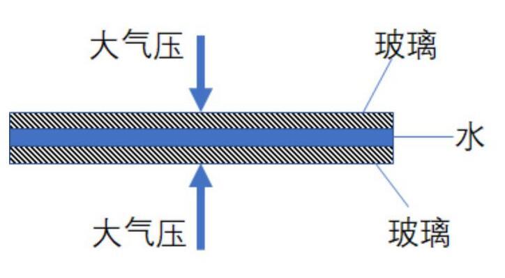 流行科普上講,由于玻璃之間充滿了水,它們之間沒有空氣,因而靠大氣壓就可以把它們緊密地擠壓在一起。如下圖所示: