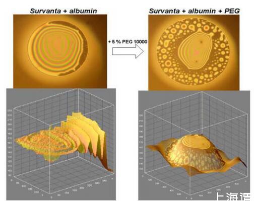 值得注意的結果是,兩種親水性聚合物葡聚糖和PEG 10000在BSA存在下恢復ESPs表面性能的效率不同:葡聚糖對Curosurf更有效,PEG 10000-對Survanta更有效。這表明HP的影響不僅可以用正滲透壓來解釋,還可能與聚合物對本體表面活性劑聚集體結構的不同影響有關(4)。