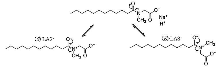 Bordes等人研究了氫鍵對(duì)甘氨酸鹽和肌氨酸鹽自組裝的影響[17]。Gad等人研究了具有不同碳鏈長度的N-酰基肌氨酸鹽的界面張力[3]。還對(duì)含有SLA的二元混合物與Gemini表面活性劑[18]和陽離子聚合物[19]進(jìn)行了一些界面研究。然而,這些研究沒有考慮它們的pH影響。Tsubone等人在pH值為10.5[20]時(shí)對(duì)SLA進(jìn)行了界面張力測(cè)量。然而,SLAS水溶液的界面張力在很大程度上取決于pH,在膠束前和膠束后區(qū)域中,當(dāng)pH小于約7時(shí),其值顯著下降。cmc和C20在較低pH下也會(huì)降低,但cmc/C20比在pH<7.3時(shí)增加。該比值的增加通常意味著親水頭的尺寸增加和/或與反陽離子的締合增加。在pH<7.3時(shí),Γmax也急劇增加。這些結(jié)果清楚地表明,在空氣-水界面的較低pH區(qū)域,SLA的Na+陽離子被H+取代。向溶液中加入Tl+,證實(shí)LAS的界面張力?并且它們以H+<Na+的順序增加,這與這些結(jié)果一致。此外,我們使用1H-NMR和13CNMR研究了D2O和CD3OD中HLA和SLA的結(jié)構(gòu)差異。根據(jù)這些結(jié)果,例如,來自LAS親水部分中1小時(shí)的所有信號(hào)?可以想象,HLA和SLA都具有共振結(jié)構(gòu),(Z)-LAS?和(E)-LAS?,如圖9所示。通過NMR[21,22]的膠束化也報(bào)告了這些SLAS異構(gòu)體的存在。根據(jù)分裂峰的積分比,Z/E形式的豐度比確定為SLA為1:1,HLA為2:1。由于E型比Z型體積大,這可能是Γmax隨pH值增加而減小的第二個(gè)原因,直到pH值為7.3。另一方面,除了RB的各向異性(在pH<7時(shí)明顯增加)外,含水體中的膠束性質(zhì)對(duì)pH的依賴性小于界面性質(zhì)。然而,在pH值降低時(shí),聚集數(shù)和流體動(dòng)力學(xué)半徑的小幅度增加趨勢(shì)以及膠束核的微極性的減小趨勢(shì)可以很好地解釋為LAS親水性頭基團(tuán)之間的靜電力減小?由Na+到H+的反陽離子置換引起,與界面性質(zhì)的情況相同。雖然我們尚未確定界面和膠束中HLA的pKa值,但這些值應(yīng)大于水溶液中的pKa值(pKa,bulk=3.3);界面處的值可能略大于膠束中的值。pH<7時(shí)體積較小的Z型的增加也與膠束性質(zhì)相容,并可能與膠束親水部分附近RB各向異性的增加直接相關(guān)。