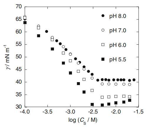 在圖1中,僅含SLAS且不含任何緩沖液的水溶液的界面張力(γ)與總SLAS摩爾濃度(CS)的對(duì)數(shù)作圖。如圖所示,盡管SLAS仔細(xì)重結(jié)晶,但γ值出現(xiàn)了異常的最小值。然后,樣品溶液的pH值在浸漬底部約為5.5,并隨CS增加至約8。由于此浸漬應(yīng)是由取決于SLAS濃度的pH變化引起的,因此所有實(shí)驗(yàn)均在磷酸鹽和硼酸鹽緩沖液控制的恒定pH下進(jìn)行。則圖1中觀察到的下降在每個(gè)值的受控pH下完全消失(見圖2)。cmc后,pH 5.5下的γ值略有增加,因?yàn)闃悠啡芤旱膒H因其緩沖容量的限制而緩慢增加。在1.0mM(膠束前濃度)和25mM(膠團(tuán)后濃度)的恒定CS下,γ值相對(duì)于pH值繪制在圖3中,其中還繪制了十二烷基硫酸鈉(SDS)的結(jié)果作為對(duì)比示例。與SDS相比,非常有趣的是,當(dāng)pH值低于約7時(shí),SLAS的γ值顯著降低。接下來,圖4中繪制了cmc和C20(其γ值比純水的γ值降低20 mN/m時(shí)的表面活性劑濃度)與pH的關(guān)系圖。這兩個(gè)值在較低pH值區(qū)域也降低,盡管SDS的pH值不隨pH值而變化(數(shù)據(jù)未顯示)。此外,如該圖中cmc/C20比率的曲線圖所示,這些比率在pH值小于7.3的區(qū)域內(nèi)增加。該比率的增加通常意味著親水性頭基的尺寸增加和/或表面活性劑的反離子與頭基的結(jié)合更緊密[11]。
