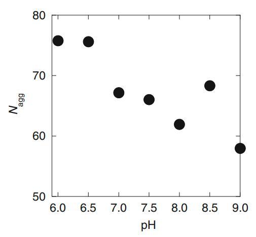 為了評(píng)估膠束(Nagg)的聚集數(shù),我們使用帶有猝滅劑(HPYL)的探針(Py)的穩(wěn)態(tài)熒光猝滅方法[8]。已發(fā)現(xiàn)該探針-猝滅劑對(duì)適用于評(píng)估幾種膠束系統(tǒng)的Nagg[14,15]。Cs=25 mM時(shí)的評(píng)估Nagg值如圖7所示。如圖所示,Nagg數(shù)值總體上隨著pH值的增加而降低。然而,似乎在pH 6.5-7附近也存在一個(gè)斷裂點(diǎn)。如果是這樣,膠束中HLA的pKa預(yù)計(jì)在6.5到7.0之間,這也比水溶液中的pKa大,就像空氣-水界面的結(jié)果一樣。為了進(jìn)行進(jìn)一步討論,我們需要更精確地確定這些Nagg值。