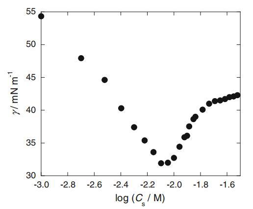 通過測(cè)量磷酸鹽和硼酸鹽緩沖液水溶液中的界面張力、熒光、動(dòng)態(tài)光散射等,研究了陰離子表面活性劑正十二烷基肌氨酸鈉(SLAS)的pH依賴性。SLAS的界面張力(γ)隨著pH值的降低而顯著降低,并在pH>7.3時(shí)保持恒定。臨界膠束濃度(cmc)和表面活性劑濃度(在其γ值比純水(C20)降低20 mN/m時(shí))的觀察值隨著pH值降低而降低,而在pH>6.5和>7.3的情況下也分別保持恒定。另一方面,當(dāng)pH<7.3時(shí),SLAS的界面過量增加。通過添加取代SLAS的Na+的Tl+進(jìn)一步研究了這些界面行為。LAS的觀測(cè)γ值?考慮到靜電相互作用和親水性頭基的分子結(jié)構(gòu),詳細(xì)討論了這些界面和膠束性質(zhì)。