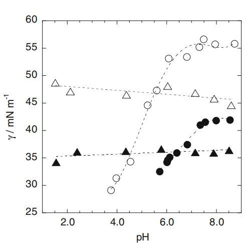 圖3 CS=1.0和25mm時(shí)界面張力(γ)與pH的關(guān)系圖:白色crcles 1.0mm SLAS,白色三角形1.0mm SDS,黑色圓圈25mm SLAS,黑色三角形25mm SDS