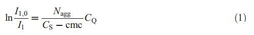 為了通過穩(wěn)態(tài)熒光猝滅法評(píng)估膠束的平均聚集數(shù)(Nagg),使用芘作為熒光探針,選擇HPYC作為靜態(tài)猝滅劑[8]。該方法基于已知濃度的猝滅劑對(duì)發(fā)光探針的猝滅。通過使用以下等式[8]分析淬火實(shí)驗(yàn):