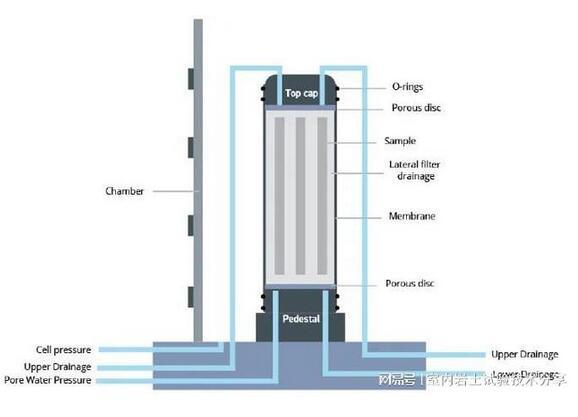 典型的三軸試驗涉及將高度直徑比為2:1的密封圓柱形土壤試樣限制在加壓壓力室中,以模擬定義的應力條件。然后對試樣進行剪切,直到破壞,從而確定其剪切強度特性。試樣通常先飽和,然后固結,最后剪切,大多在壓縮條件下。