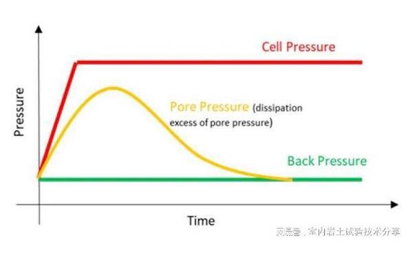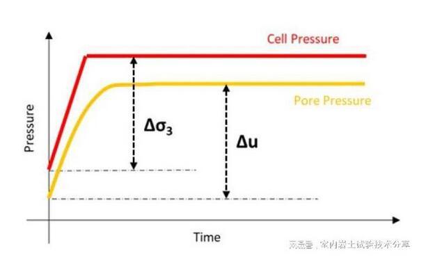 飽和后,試樣通常被固結到代表其原位條件的應力狀態。固結通常是各向同性的應力-垂直和水平施加給樣品的應力相同(σ3=σ1)。然而,固結也可以是各向異性的,其中σ3≠σ1。在這種情況下,測試通常縮寫為CIU(各向同性固結不排水)或CAU(各向異性固結不排水)。試樣固結通常通過增加圍壓進行,同時保持恒定的反壓(通常等于最終飽和度B檢測期間達到的孔隙壓力)。