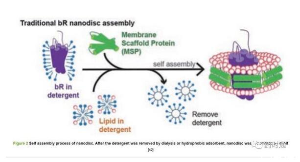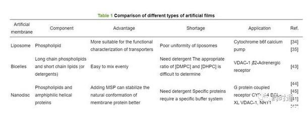 與雙胞體一樣,納米盤的第一步是基于洗滌劑的增溶,需要優化所使用的洗滌劑的性質和濃度,這在納米盤重組中可能造成蛋白質活性損失,因此同樣存在洗滌劑使用相關問題的限制。表1[34,35,41-45]比較了脂質體、雙胞體、納米盤的組成及其優缺點。
