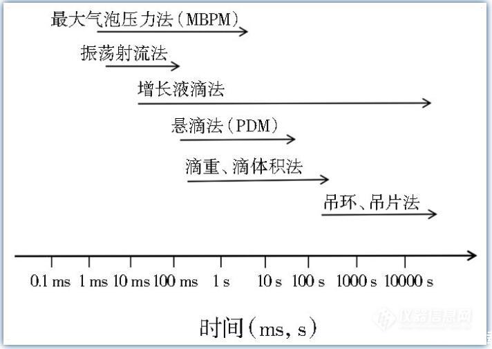 由于對DST時間范圍界定的不同,可運用的測量手段也有所不同。王建坤等認為,在達到靜態表面張力前的表面張力變化都可算是DST,這個時間范圍以幾毫秒到幾小時計。可用Wilhelmy吊片法、DuNouy吊環法、滴重法、滴體積法、懸滴法、最大氣泡壓力法測定DST。
