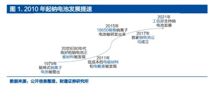 鈉電池隨著產(chǎn)業(yè)化加速,量產(chǎn)在即。1979年法國的Armand提出了“搖椅式電池”的概念,開始鈉離子電池的研究。隨后Delmas和Goodenough發(fā)現(xiàn)了層狀氧化物材料可作為鈉電池正極材料,Stevens和Dahn發(fā)現(xiàn)硬碳材料作為負(fù)極有良好的鈉離子嵌脫性能。2010年以來,鈉電池的研發(fā)進程加速。2011年中科院物理所研究員團隊開始了鈉離子電池核心技術(shù)的研發(fā),自此以后開發(fā)出低成本的電極材料。2017年國內(nèi)第一家專注于鈉離子電池研發(fā)和生產(chǎn)的公司中科海鈉成立。2021年寧德時代成功舉行了第一代鈉離子電池線上發(fā)布會。2022年,中科海納和傳藝科技均預(yù)計2023年量產(chǎn)其鈉離子電池。