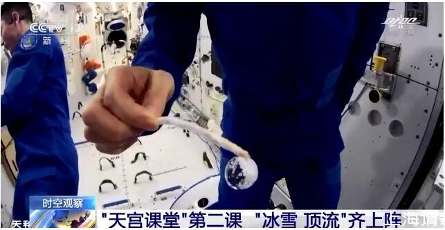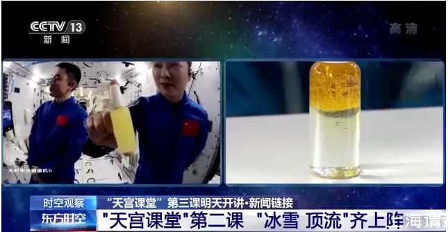 在約45分鐘的授課中,航天員演示了微重力環境下太空“冰雪”實驗、液橋演示實驗、水油分離實驗、太空拋物實驗,講解了實驗現象背后的科學原理,還展示了部分空間科學設施。