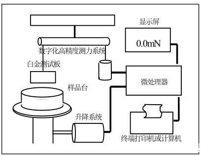 當白金板接觸到樣品液后,樣品液的表面張力會將白金板往下拉。基于高精度電子天平的數(shù)字化檢測系統(tǒng)檢測到這個微小的力并傳到微處理機進行處理。