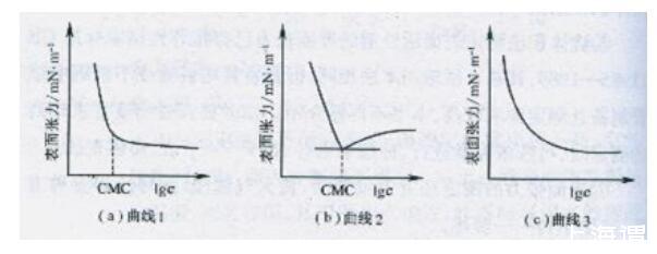 測量原理:溶液的表面張力主要取決于溶液中表面活性劑單體的濃度。當有膠束形成后,單體的濃度幾乎不變,所以表面張力對濃度作圖會出現明顯的轉折。一般都是濃度取對數坐標,所得曲線成為γ-logγ曲線,曲線上的拐點即可求出CMC,如果拐點不明顯,可將拐點兩邊的直線部分延長,由交點求出CMC。(圖3)表面活性劑水溶液的表面張力在濃度很低的時候隨著濃度的增加而急劇下降,到達一定濃度后(CMC)后變化緩慢或不再改變。