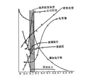 臨界膠束濃度的英文表達為:Critical Micelle Concentration,可縮寫為CMC。自從Mcbain于1925年首次提出膠束(團)的概念,認為當濃度升至一定值時,肥皂分子在水溶液中從單體締合為“膠態聚集態”,并稱之為“膠束”或“膠團”(圖1)。所形成的這些膠束是熱力學穩定的,從而將形成膠束時的濃度稱為臨界膠束濃度,簡稱為CMC。含有表面活性劑溶液體相中一旦形成了膠束或膠團后,溶液體相的一系列性質會發生改變(圖2),例如摩爾電導率、表(界)面張力、去污力、滲透壓以及增溶、吸附量等突變是因為溶液體相中出現了表面活性劑聚集態,這些性質的變異通常都發生于一個窄濃度范圍,而將這個窄濃度范圍定義為臨界膠束濃度,獲取的方法就是將CMC兩側溶液性質連續變化的曲線延長至相交,交點所對應的濃度為CMC。