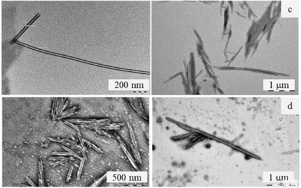 為了進一步證實這些大聚集體的形態,SCAG、SCAA、SCAS和SCOS水溶液的TEM顯微照片如圖3所示。SCAG和SCAA水溶液中形成球狀囊泡,而SCAS和SCOS自聚集成管狀囊泡。對于SCAG和SCAA,觀察到的球形囊泡的直徑分別約為1μm和100-200 nm,與DLS測量結果一致。SCAS和SCOS的小管長度L≤4μm,直徑d≤40 nm和100 nm。這些與DLS結果一致,表明由SCOS形成的聚集體的等效流體動力學直徑大于來自SCAS的聚集體。TEM結果表明聚集體的形態取決于氨基酸殘基和疏水尾部的結構。對于源自蓖麻油的表面活性劑,疏水尾部的-OH基團促進了球形囊泡的形成;而對于絲氨酸頭基上帶有-OH基團的表面活性劑,小管更穩定。