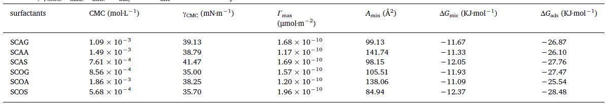 表1顯示合成表面活性劑的CMC值在0.568-1.86 mM范圍內。與其他表面活性劑相比,帶有最疏水丙氨酸殘基的表面活性劑(SCAA和SCOA)具有相對較高的CMC。SCAA頭部區域的強疏水性和SCOA可能會阻礙膠束界面區域的水/頭基相互作用,從而增加它們的CMC。γCMC的值在35.00到41.47 mN·m-1之間,棉籽油衍生的表面活性劑的γCMC值普遍低于衍生的表面活性劑的γCMC值來自具有相同頭部基團的蓖麻油。SCOS獲得了最高Γmax值和最低Amin值,表明在其頭部基團上帶有-OH基團的SCOS單體在空氣/水界面上更緊密地堆積。鑒于蓖麻油衍生的表面活性劑疏水尾部存在-OH基團,我們得出結論,頭部基團上的-OH基團與尾部的表現不同。所有表面活性劑的ΔGmic和ΔGads的負值意味著兩者在水中的膠束化在298.15 K下,空氣/水界面處的吸附是自發過程。對于SCOS也獲得了最大的ΔGads和ΔGmic絕對值,表明絲氨酸殘基上的-OH基團有助于膠束化和吸附。