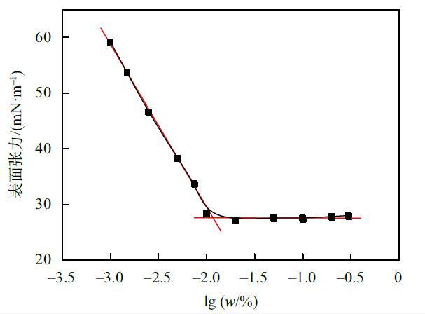 選擇陰離子-非離子表面活性劑復(fù)配體系,以十二烷基硫酸鈉(SDS)和烷基糖苷(APG)復(fù)配組分作為實(shí)驗(yàn)對(duì)象,質(zhì)量比為1:1。實(shí)驗(yàn)結(jié)果見表2。試樣的表面張力曲線圖如圖2所示。